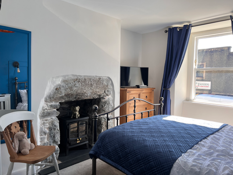 With ensuite shower and smart TV, featuring an original stone fireplace